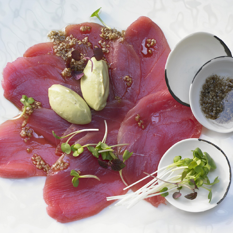 Carpaccio de Atún, finas láminas de atún. Prepáralas con hojas de rúcula, pimiento morron, sal pimienta y un toque de limón y aceite de oliva o una vinagreta a base de soya. Estuche de 100 grs.